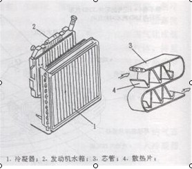 由铜管或铝管制成芯管周围焊接散热片所组成。LS—400的冷凝器装在水箱的前方。从压缩机压出的高温(约80℃)高压气态制冷剂流入冷凝器芯管中,当冷却风扇转动或车辆行驶时,空气吹过冷凝器冷却芯管中的制冷剂,使其变为中温(约40℃)高压的液态制冷剂。