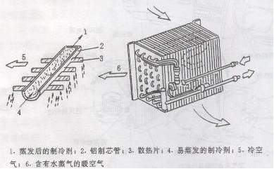 图5 蒸发器 它由铝制芯管和散热片组成。其作用与冷凝器的功用相反。制冷系统循环时,高压液压制冷剂经膨胀阀后压力降低,即开始汽化吸收芯管散热片及周围空气的热量。配置送风机加速热交换循环,使车厢内的气温下降。 4、贮液干燥过滤器 贮液干燥过滤器如图6所示。 它主要由玻璃视液镜、吸取管、粗过滤器、硅胶、过滤器及壳体所组成。它的作用是滤去制冷剂中杂质及水分,保证流出贮液干燥器为百分之百液态制冷剂。玻璃视液镜用以观察制冷剂是否够量。若视液镜很明净,表示系统有足够的制冷剂;如出现气泡,则表示系统进入了空气;若见到乳白色雾状物,说明干燥过滤剂已从贮液干燥过滤器中逸出,随制冷剂一起在系统中循环。
