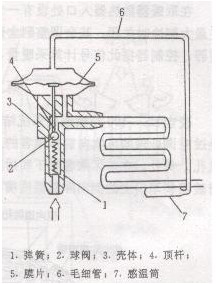 主要由感温筒、膜片、膨胀阀壳体、球阀、弹簧等部件组成。膨胀阀安装在蒸发器入口处。感温筒内装制冷剂,通过直径细小的毛细铜管连接在膨胀阀膜片的上方。感温筒捆绑于蒸发器出口的管路上。 当压缩机运转时,蒸发器出口处的热负荷使感温筒中的制冷剂膨胀,膨胀阀膜片上方的压力升高,膜片向下移动顶开球阀。来自贮液干燥过滤器的液态制冷剂从小孔喷入蒸发器,因突然膨胀而成为低压蒸气,吸收蒸发器芯管周围空气的热量而激化为低压气态制冷剂。当蒸发器出口处温度降低时,感温筒中的制冷剂收缩,膨胀阀膜片上方的压力减小,膜片向上移动,球阀开启行程变小,则喷入蒸发顺的制冷剂量减少,导致空气制冷量减少;当压缩机停止运转时,膨胀阀膜片上方的压力与蒸发器入口处压力相等,膨胀阀弹簧作用使球阀关闭,防止制冷剂倒流回压缩机。