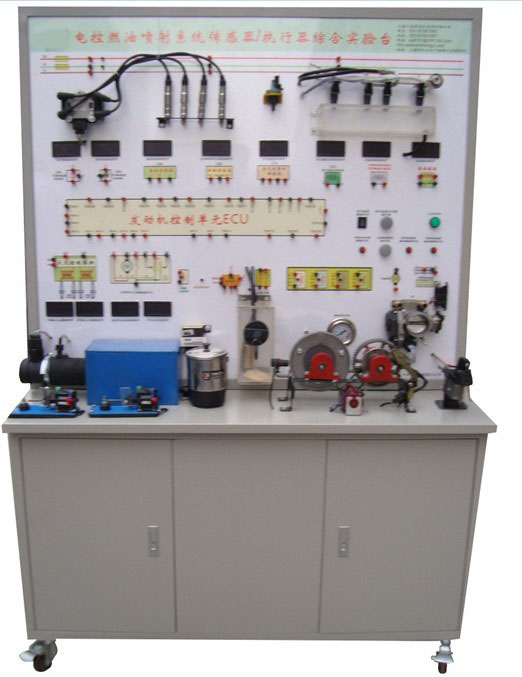 (二)结构组成 发动机电控单元、(仪表)防盗控制单元、防盗钥匙、发动机各类传感器、检测端子、故障设置系统、大容量蓄电池或12V开关电源、大型彩色喷绘电路原理图、控制面板、可移动台架、使用说明书及任务驱动式实训指导书等。 (三)功能特点 1.面板上绘有完整的发动机传感器系统原理图。设有检测端子,可通过仪器仪表检测传感器,执行器等各种信号参数如电压、电阻、频率等。 2.操纵开关及按钮,可真实演示发动机各传感器的工作过程。 3.数显表显示各传感器信号电压值。 4.发光二极管显示工作元器件状态。 5.故障模拟系统可模拟实际运行工况,设置多种实车常见故障。具体内容详见故障模拟设置装置说明。6.防盗匹配等操作。 7.汽车油漆高温烤漆处理;加装交流电源漏电保护装置;转动元器件外加装防护装置。 8.底架部分采用实验桌,台面保留30cm宽空间,方便放置检测用的仪器及仪表/实验报告等,表面采用烤漆工艺,带自锁脚轮。 9.装有诊断座,可读取故障码与数据流等。 (四)技术参数 外形尺寸:1240mm×550mm×1850mm(长×宽×高) 电源:220V交流电压 工作电压:12V直流电压 工作温度:-50℃~50℃