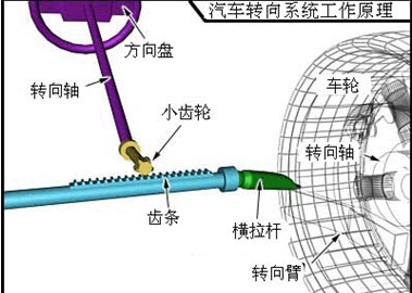 | 2013年汽车转向系统工作原理详解图 我们知道,当转动汽车方向盘时,车轮就会转向。 这是一种因果关系,不是吗? 但是,为了使车轮转向,方向盘和轮胎之间发生了许多有趣的运动。 在本文中,我们将了解两种最常见的汽车转向系统的工作原理: 齿条齿轮式转向系统和循环球式转向系统。 随后,我们将介绍动力转向,并了解一些有趣的转向系统发展趋势,这些趋势大多源于人们对汽车省油功能的需求。 不过,让我们先看一下让汽车转向所必须执行的操作。 这并不像您想像的那么简单! 小齿轮连在转向轴上。 转动方向盘时,齿轮就会旋转,从而带动齿条运动。 齿条各齿端的横拉杆连接在转向轴的转向臂上(请参见上图)。 齿条齿轮式齿轮组有两个作用: •将方向盘的旋转运动转换成车轮转动所需的线性运动。