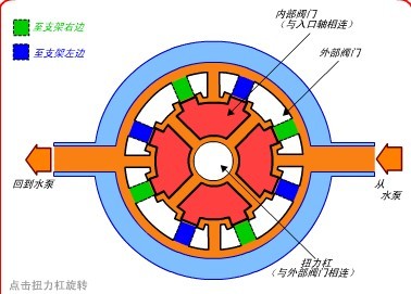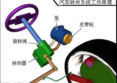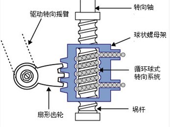 部分齿条包含一个中心有活塞的圆筒。 活塞连接在齿条上。 圆筒上有两个油孔,分别位于活塞的两侧。 当向活塞的一侧注入高压液体时,将迫使活塞向另一侧运动,进而带动齿条运动,这样便提供了辅助动力。 我们将在随后介绍提供高压液体的组件,它同时也能决定向齿条的哪一侧供应这些高压液体。 首先,让我们来了解另一种转向系统。 目前,众多货车和SUV上都在使用循环球式转向系统。 其转动车轮的拉杆与齿条齿轮式转向系统稍有不同 螺栓并不直接与金属块上的螺纹结合在一起,所有螺纹中都填满了滚珠轴承,当齿轮转动时,这些滚珠将循环转动。 滚珠轴承有两个作用: 第一,减少齿轮的摩擦和磨损;第二,减少齿轮的溢出。 如果齿轮溢出,则会在转动方向盘时感觉到。而如果转向器中没有滚珠,轮齿之间会暂时脱离,从而造成方向盘松动。 循环球式系统中的动力转向工作原理与齿条齿轮式系统类似。 其辅助动力也是通过向金属块一侧注入高压液体来提供的。 现在让我们看一下构成动力转向系统的其他组件。 在动力转向系统中,除齿条齿轮机制或循环球机制外,还有几个重要组件。 当叶片旋转时,这些叶片会从压力较低的回流管吸入液压油,并迫使其流向压力较高的出口。 泵所提供的流量取决于汽车发动机的速度。 泵的设计必须能在发动机怠速时提供足够的流量。 因此,当发动机加速运转时,该泵提供的液体会远远超过实际的需要。 泵中含有一个减压阀,用于确保压力不会升得太高。当发动机高速运转时,由于泵中吸入了太多液体,因而更需要减压阀来降低压力。 旋转阀 旋转阀的关键部位是扭力杆。 扭力杆是一根细金属杆,在向其施加扭矩时,它会发生扭转。 扭力杆的顶端连接在方向盘上,底端则连接在小齿轮或埚杆(用于转动车轮)上,这样扭力杆中的扭矩便等于驾驶员用来转动车轮的扭矩。 驾驶员用来转动车轮的扭矩越大,扭力杆扭转的幅度就越大。
