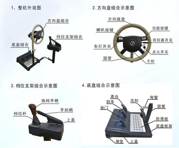 简易汽车驾驶模拟器。安装了方向盘、离合器、油门、脚刹、手刹、档位、转向灯灯操作部件,但是没有配置电脑,也没有显示器,学员可以利用这种模拟器熟悉档位等部件的操作,是属于最简单的模拟器。