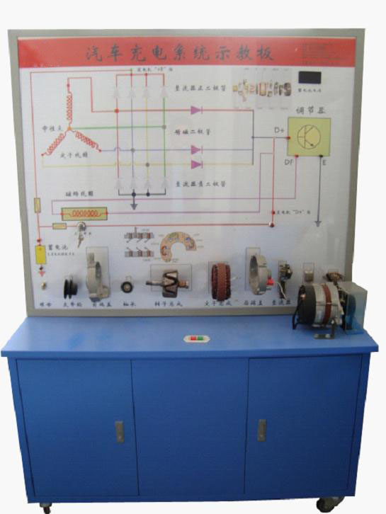 汽车充电系统示教板,选用汽车充电系统实物,展示汽车充电系统的结构与原理;电机驱动模拟发动机运转,示教板可产生自行充电,示教板上部还对发电机进行解剖、了解发电机的基本构造,面板上绘有完整的充电系统的电路图,设置有检测端子,可通过仪器仪表检测各种信号参数如电压、电阻、频率等。本示教板功能齐全、操作方便、安全可靠。 (二)结构组成 充电系统示教板上半部分为发电机的分解零部件,下半部分为实物总成;蓄电池、点火开关、电源总开关、彩色原理与结构图、故障设置系统、交流电动机及使用说明书及任务驱动式实训指导书等。 (三)功能特点 1.操纵开关及按钮,可真实演示汽车充电系统的工作过程。 2.数显表显示充电电压值; 3.通过面板上对应的电路检测端子,可测试电压、电流、阻值等各种信号参数; 4.发光二极管显示发电机状态; 5.故障模拟系统可模拟实际运行工况,设置多种实车常见故障。具体内容详见故障模拟设置装置说明。6.汽车油漆高温烤漆处理;转动部件外加装防护装置;加装交流电源漏电保护装置。 7.底架部分采用实验桌,台面保留30cm宽空间,方便放置检测用的仪器及仪表/实验报告等,表面采用烤漆工艺,带自锁脚轮。 (四)技术参数 外形尺寸:1240mm×550mm×1850mm(长×宽×高); 动力电源:220V交流电压; 工作电压:12V直流电压; 工作温度:-50℃~50℃; 蓄电池:60AH/12V 电机:220V/750W