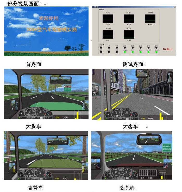 1、界面仪表盘上显示有: 车速表、发动机转速表、大灯、(远光灯、近光灯、视宽灯)、转向灯、安全带提示灯、车门关闭提示灯、警告灯及机油电瓶灯等,与硬件配合,错误操作进行扣分并具有语音提示。 2、界面显示新增加了: 80度全新视角宽频模拟驾驶、转向、油门、刹车、离合器深浅进度显示;档位、训练成绩,后视镜(左、右、中)、场景地图显示;与硬件配合。驾驶模拟软件采用汽车多自由度数学模型,实现汽车转向、制动和加速的逼真模拟;另外利用最新的计算机技术,实现真实的三维场景及逼真的声音模拟。 训练场景科目 训练场景包括: 一般道路:场景中有铁道路口、单行道、限定距离换档等内容。 高速公路:场景中有超车道、行车道、出口等交通标志牌,车距确认、隧道、高速公路出入口等内容。 城市道路:场景中有立交桥、十字路口、丁字路口、环形岛、环城路、行人横穿道路等内容。 危险道路:危险场景中设置有行人突然横穿公路、路口突然出现横穿自行车、路口突然出现汽车、道路维修等危险状况。 场地训练:曲线穿桩、倒车移位、 “8”字型路、直角弯路、蛇行路、就位停车、顺心停车、斜位停车、双边桥、右单边桥、左单边桥、单凸桥、双凸桥、横断路、骑越障碍、山区道路、坡道。 场地9项:通过连续障碍、通过单边桥、直角转弯、侧方位停车、上坡定点停车与坡道起步、限速通过限宽门、百米加减档、起伏路驾驶、曲线行驶。 3 训练天气选择 学员可以选择“白天”、“雪天”、“雾天”、“雨天”及“黑夜”,体会不同天气状况下的驾驶特点(例如,雪天路面极滑,雾天视线极其不好等)。 4 训练车型选择 学员可以选择“桑塔纳”、“吉普车”、“东风车”、“大客车”作为训练车辆,在模拟器上体会不同车型的特点。 5 其他车辆选择 学员可以根据驾驶的熟练程度,分4种级别选择场景内的其他车辆的数量,场景内最多可达60辆其他车辆,达到模拟逼真的交通流状况。 6界面显示 档位显示,训练成绩,后视镜(左、右、中)、逼真汽车仪表(车速、里程、发动机转速)、场景地图。在训练过程中,通过双击鼠标,可实现正视图像与俯视图像驾驶之间切换,从而清楚的观察车辆与路面的位置关系。 7测试调整功能 机器是否正常,只要打开测试界面便一目了然。可作为学员模范教练操作曲线。 8 播放VCD 利用该功能,可以播放电子版本汽车培训教学教材。 9 历史记录及错误明细 训练完毕后,学员可以查看训练过程中所出现的错误动作,并且可以将训练成绩及错误明细表作为历史记录保持下来。 10 复现功能 训练结束后,学员可以以俯视的方式查看最后30秒的驾驶过程,从而仔细分析错误驾驶发生的原因,以便以后改正。 11 定时训练 学员可以设定训练时间,训练时间一到,系统自动退出训练界面。 12 操作错误检测项目 系统对学员操作各操作部件正确与否进行判断,如启动时是否踩下离合器、闯红灯报警等。与前面版本不同的是,区别判断“离合器松得太快”和“发动机转速过低”。 13 无纸化考试 无纸化考试采用标准化试题,题库里共有11套试题(共1100道试题),可以随机出题考试以可以依次考试每套试题。与现有无纸化考试系统最大的区别在于:无纸化考试试题集成在驾驶模拟器系统之中,可以利用模拟器进行。 14 交通标志、标线及交通法规 交通标志、标线包括所有的禁令标志、禁止标线、警告标线、警告标志、指路标志、指示标线、指示标志。 交通法规包括:道路交通安全法、道路交通安全法实施条例、道路交通安全违法行为处理程序规定、道路交通事故处理办法、道路交通事故处理程序规定、高速公路交通管理办法、机动车登记办法、机动车登记规定、机动车驾驶员培训管理规定、机动车驾驶证申领和使用规定、交通违章处理程序规定。 15 中央监控台 中央监控台由P4计算机、17″显示器、打印机、 100M 网络交换机等组成。中央主控台与学员机联网后可监控在其联网下的任意一台模拟器,监视窗口将显示与被监视模拟器完全一样的视景画面,并实时图形显示其“五大”操作件——方向盘、离合器、脚制动、油门及手制动当前的状态;另外档位、喇叭、转向灯、点火开关等的状态也通过图示表示出来。监控计算机可以查看联网的每一台模拟器当前错误操作的明细情况,并将训练成绩进行打印。