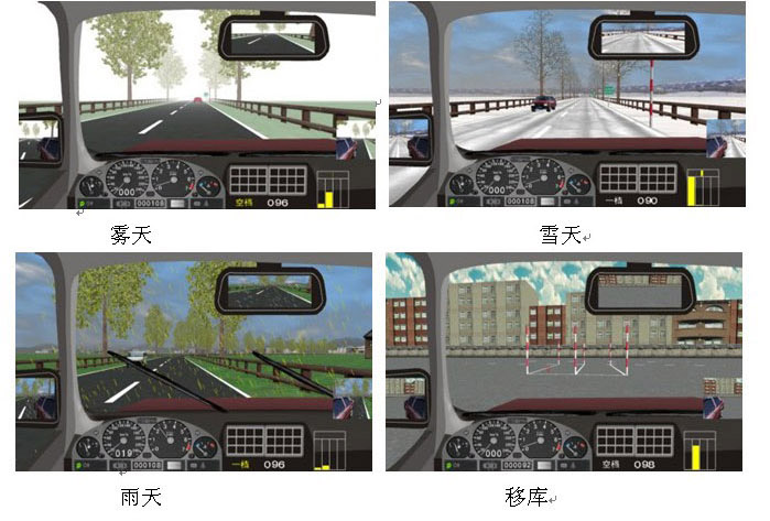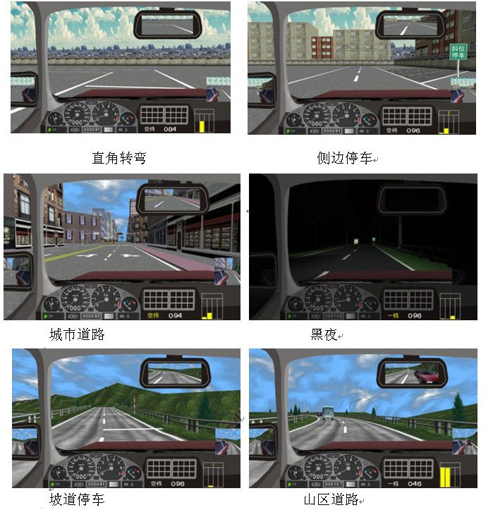 本模拟系统界面里不同车型之间自由转换,其车型有桑塔纳、吉普车、东风车、大客车等在模拟器上体会不同车型的驾驶特点。其他车辆选择方面,学员可以根据自己驾驶的熟练程度,分4种级别选择场景内的其他车辆的数量,及九项专项训练。场景内最多可达60辆其他车辆,达到模拟逼真的交通流状况。系统新增加了:安全带、双雨刷、夜间驾驶远近灯光的控制、场地9项(通过连续障碍、通过单边桥、直角转弯、侧方位停车、上坡定点停车与坡道起步、限速通过限宽门、百米加减档、起伏路驾驶、曲线行驶等)。训练天气选择方面有:学员可以选择“白天”、“雪天”、“雾天”、“雨天”、“黑夜”,体会不同天气状况下的驾驶特点(例如,雪天路面极滑;雾天视线极其不好;夜间驾驶会车时要远近灯光的切换等)。 本系统完全符合最新的驾驶员培训大纲及交通部最新驾驶模拟器行业标准JT/T398-2005。