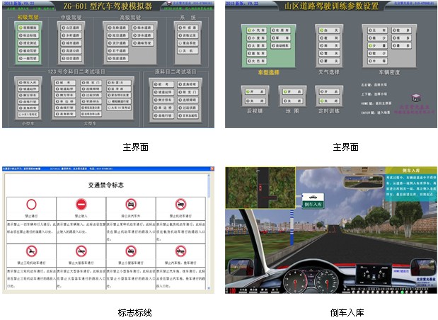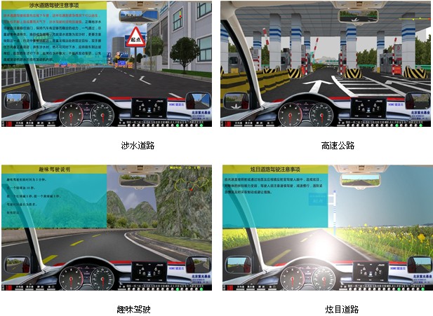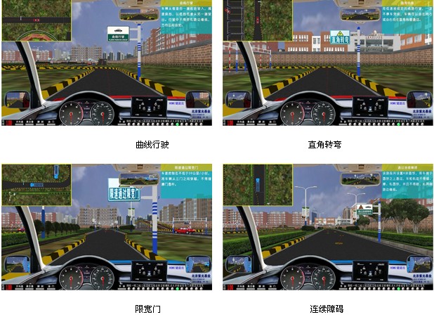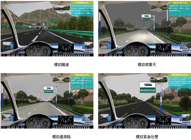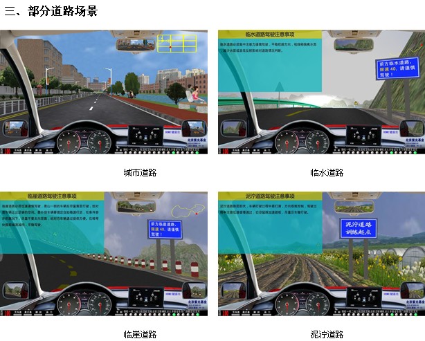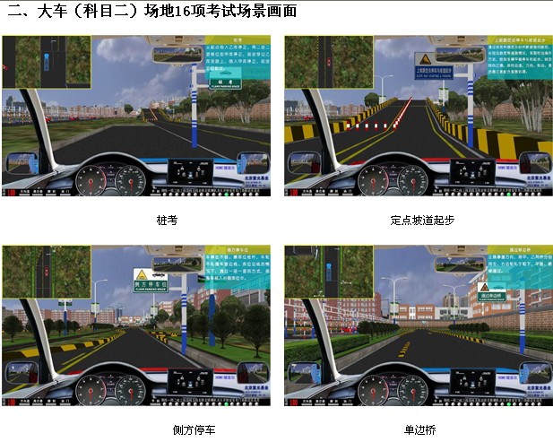 五、 训练场景科目 模拟训练项目:泥泞道路、危险场景、石子路面、涉水道路、山区到路、乡村道路、城市道路、高速公路、桩考、坡道定点停车和起步、侧方停车、通过单边桥、曲线行驶、直角转弯、通过限宽门、通过连续障碍、起伏路行驶、窄路掉头、模拟高速公路、连续急弯山区路、隧道、雨(雾)天、湿滑路、紧急情况处置。道路驾驶技能考试内容包括:上车准备(系安全带)、起步、直线行驶、加减挡位操作、变更车道、靠边停车、直行通过路口、路口左转弯、路口右转弯、通过人行道、通过学校区域、通过公共汽车站、会车、超车、掉头、夜间行驶等训练考试项目.