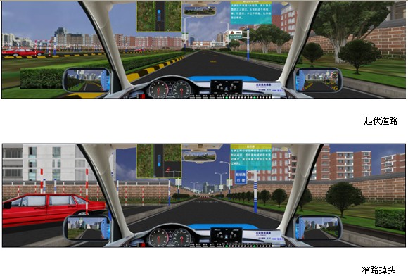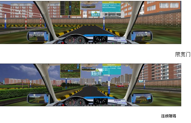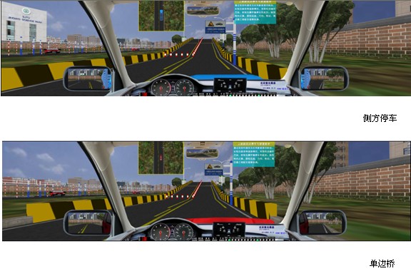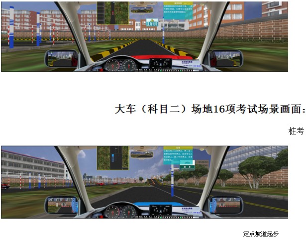 小车(科目二)场地5项分别为:倒车入库、坡道定点停车和起步、侧方停车、曲线行驶、直角转弯;大车(科目二)场地16项分别为:桩考、坡道定点停车和起步、侧方停车、通过单边桥、曲线行驶、直角转弯、通过限宽门、通过连续障碍、起伏路行驶、窄路掉头、模拟高速公路、连续急弯山区路、隧道、雨天、雾天湿滑路、紧急情况处置。新版汽车驾驶模拟器软件道路驾驶技能考试(科目三)内容包括:上车准备(系安全带)、起步、直线行驶、加减挡位操作、变更车道、靠边停车、直行通过路口、路口左转弯、路口右转弯、通过人行横道线、通过学校区域、通过公共汽车站、会车、超车、掉头、夜间行驶等训练考试项目。
