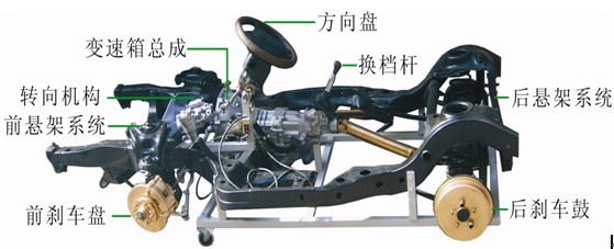 展示盘式制动器,鼓式制动器、驻车制动器和液压系统内部结构和剖视结构。附加部件真空助力器、 1 只真空表、 2 只油压表。适用于实践教学,解释制动衬片和蹄的更换、调整及放气过程。