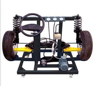 1.产品简介:该设备采用大众捷达汽车前桥总成为基础,全面展示了动力转向系统、前桥悬架系统的组成结构和工作过程。适用于中高等职业学校和培训机构对汽车动力转向、前桥悬架理论与维修实训教学需要,完全满足对汽车前桥系统结构展示、工作模拟、拆装实训等教学功能。主要实训项目:汽车动力转向实训、汽车转向横拉杆调整实训。 2.结构组成:前桥悬挂、避震、弹簧、轮毂、车轮、三相电机、助力泵、油压表、移动台架 3.功能: 真实可运行的汽车前桥悬架部件,充分展示悬架的组成结构。由三相电机做动力源带动助力泵工作,操纵方向盘,真实演示汽车动力转向的工作过程。实训台安装有压力表,实时显示转向时助力油压的参数变化。