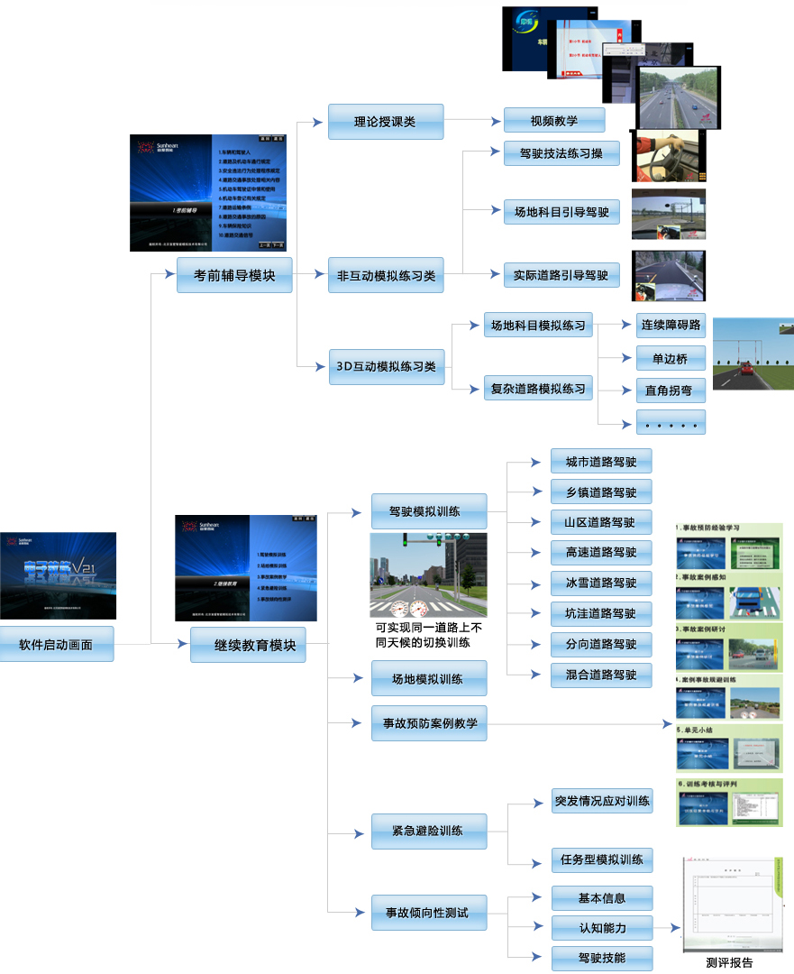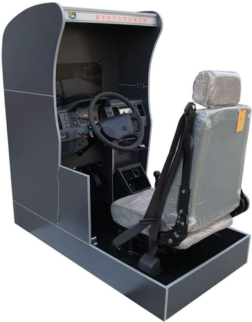 本公司生产的汽车驾驶模拟器是国内最具先进的自主开发并拥有自主知识产权的汽车模拟驾驶系统,并吸收国外汽车驾驶模拟设备的先进技术的同时,结合本国国情,道路的模拟部分和标志标线全部按照国家交通法规设计、道路全部为国内道路,各操作方法与真车无异,视觉效果采用计算机实时成像、逼真度高,声音采用计算机语音合成技术,能逼真模拟汽车行进中的各种机械动力声、喇叭声、周围环境声等,是附合我国驾驶员培训与教学、中学劳技教育与通用技术课程的现代化教学设备。