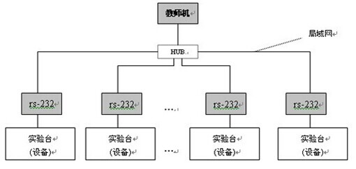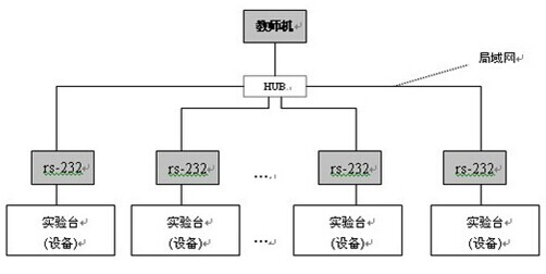 本系统由一台服务器(数据库服务器)带多台设备组成,通过集线器组成一控多的实训网络。服务器系统通过RS-232接口与实验台的智能CPU通讯,采集实验数据,反馈实验结果。系统拓扑结构见下图。