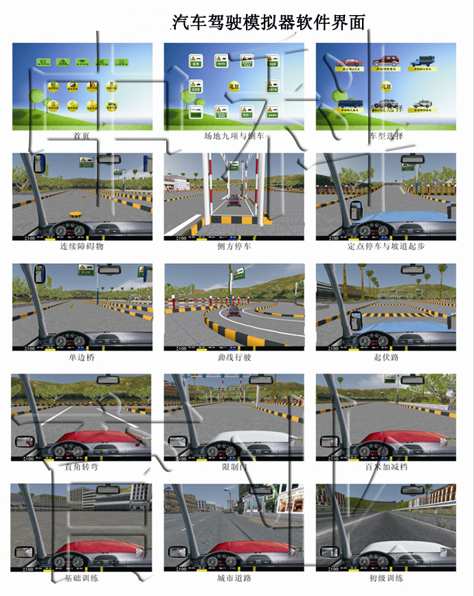 特色1:示范教学录像自动录制及配置 实现教学示范录像自动录制,教练员可以自己在模拟器上按照考试标准进行驾驶,系统进行录制并自动配置操作提示语音,方便学员按照规范进行训练。教练员录制示范录像时候,系统根据教练员的操作,自动配置操作提示语音,如“踩离合器”,“松离合器”,“挂1档”,“左转方向盘”,“准备停车”等等。 特色2:全天候(变化天气)训练 目前的驾驶模拟软件只支持单一的训练天气,如“晴天”,“雨天”等等。本系统除了设置单一训练天气“晴天”,“雪天”,“雨天”,“黑夜”,“雾天”外,还设置了“全天候”天气训练,在一个训练场景中变换训练天气,例如开始训练时候可能是晴天,训练一段时间后变为“雨天”,过一段时间后又变为黑夜,训练学员对于各种不同天气的适应能力。 特色3:二十多种训练车型 系统提供“手动档小汽车”,“手动档吉普车”,“手动档大货车”,“手动档大客车”,“自动档小汽车”和“自动档吉普车”二十多种训练车型。 1 、基础驾驶 基础驾驶包括“原地驾驶训练”,“基础驾驶技能训练”,“初级训练场景”。 1.1 、原地驾驶 原地驾驶主要用于初级学员进行换档训练,练习换档时候与离合器的配置,目的是使得学员可以不低头就可以实现踩离合器和正确换档。 1.2 、基础驾驶技能训练 “基础驾驶技能训练”主要训练学员起步、停车、倒车以及通过控制离合器实现半联动驾驶,目的是使得学员熟练掌握半联动驾驶技能,为场地训练打下坚实的基础。 1.3 、初级训练场景 “初级训练场景”主要用于训练学员的初级道路驾驶技能,为道路训练打下坚实的基础。 2 、场地驾驶(新规小车必考5项) 场地驾驶包括场地九项和倒库,即“倒车入库”,“侧方停车”,“坡道停车和起步”,“曲线行驶”,“直角转弯对于这5项训练内容,大车和小车有不同的训练场景,大车15项场景。所有的考核和评判严格按照公安部标准进行。 进行场地训练时,如果考试不合格,则系统自动将车辆退回到起点位置,方便学员重新进行训练和考试。 2.1 、倒车入库 “倒车入库”考核机动车驾驶人操控车辆完成倒车入库和正确判断车身空间位置的能力。 2.2、侧方停车 “侧方停车”让驾驶员掌握将整车正确停于路右车位(库)中的技能,以适应日常驾驶生活中临时停车的需要。 驾驶人员驾驶车辆在不碰,擦库位桩杆,车轮不压碰车道边线,库位边线的情况下,通过一进一退,将整车移入右侧车库位中。 评判及提示语有:侧方停车考试开始,侧方停车考试结束,车辆在入库后车身出线,碰擦桩杆,行驶中轮胎触轧车道边线,中途调整车身位置。 2.3、坡道停车和起步 考核机动车驾驶人在坡道上驾驶车辆的技能,准确判断车辆的位置,正确使用制动、挡位和离合器,以适应在上坡路段停车与起步的需要。核驾驶员上坡路的驾御车辆的能力,正确的固定地点靠边停稳车辆的能力,以准确适用档位和离合器的能力,以适应在上坡路段等候放行时的操作需要。 机动车驾驶人应通过视觉和感觉及时判断坡道的坡度大小、长短及路宽等道路情况,采取正确的操作方法,控制车辆平稳停车和起步。做到转向正确,换挡迅速,操纵加速踏板、驻车制动器和离合器踏板的动作准确协调。 评判及提示语有:“坡道定点停车和起步”考试开始,“坡道定点停车和起步”考试结束,车辆停止后,汽车前保险杠距离桩杆线超过50厘米,车辆保险杠未停于桩杆线上,前后超过 20厘米,不超过 50厘米,车辆停止后,车身距离路边缘线30厘米以上,起步时后溜大于30厘米,起步时后溜小于30厘米。 2.4、曲线行驶 考核驾驶远方向的运用与对车辆轨迹运行的掌握。 机动车驾驶人驾驶车辆从弯道的一端前进驶入,减速换挡,以低挡低速从另一端驶出。行驶中不得轧弯道边缘线,转向自如。 评判及提示语有:“曲线行驶”考试开始,“曲线行驶”考试结束,车轮驶出边缘线,车轮压路边缘线,中途调整车身位置。 2.5、直角转弯 考核驾驶员急弯路段迅速运用方向对车辆内轮差距进行正确判断。 机动车驾驶人驾驶车辆按规定的线路低速行驶,由左向右或者由右向左直角转弯,一次通过,中途不得停车。 评判及提示语有: “直角转弯”考试开始,“直角转弯”考试结束,车轮触轧突出点或者驶出边缘线,中途调整车身位置,车轮触轧道路边缘线,借助倒车完成。 3 综合训练 综合训练中,设置了“城市道路”,“高速公路”,“乡村道路”等训练场景。在各训练场景中,又设置了各种危险情况,如行人横穿公路,行人滑倒,侧风等。 综合训练中,严格按照公安部科目三考试要求进行判别和提示,判别和提示语音参见后附表格。 3.1 城市道路 城市道路场景中设置了立交桥、十字路口、丁字路口、环形岛、环城路、隧道等内容。 3.2 高速公路 场景中有收费站、超车道、行车道、出口等交通标志牌,车距确认、隧道、高速公路出入口等内容。 3.3 乡村道路、山区道路、泥泞路 设置了急弯、陡坡,泥泞路,漫水路等场景。 4 网络互联 通过中央控制台,可以连接25台驾驶舱进行联网训练。中央监控台由高性能计算机、、打印机、 100M 网络交换机等组成。监控计算机可以监控任意一台模拟器,监视窗口将显示与被监视模拟器完全一样的画面,并实时图形显示其“五大”操作件——方向盘、离合器、脚制动、油门及手制动当前的状