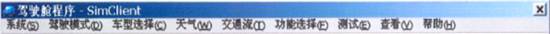 4.2菜单栏 在汽车驾驶模拟器屏幕的最上方为菜单栏,如图所示,包括:系统、驾驶模式、车型选择、天气、交通流、功能选择测试、查看和帮助等9项功能。