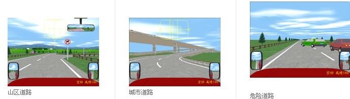 4.8.2山区道路——用于训练学员在复杂道路上的驾驶技能,包括驾驶急弯坡道等,对山区道路部分交通标志线的识别; 4.8.3城市道路——用于训练学员在城市道路上的驾驶技能,包括在叉口、立交桥等路段的驾驶,对城市道路部分交通标志线的识别; 4.8.4危险道路——用于训练学员在各种具有驾驶安全隐患的条件下的应对能力,目前共有9项,包括:驻车启动、交叉左转(并入)、前车突然并道、丁字路口左转、交叉左转(避让)、行人穿出、弯道会车、行人过街、交叉口右转等。