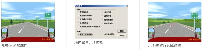 4.8.6倒库训练——用于训练学员传统的倒库训练。 4.8.7场内路考——用于训练学员的场内路考。包括了9项内容。 (1)百米加减挡 目的:考核受训者对库辆挡位的熟练掌握 通过要求:车辆由百米点线处起步,在百米内完成从最低挡逐级到最高挡的加速,以及再从最高挡逐级到最低挡的减速。 (2)通过连续障碍物 目的:考核受训者驾车通过连续障碍物时,对车轮行驶轨迹和内轮差位置的判断能力。 通过要求:该路段共设置6(3)块圆饼,要求除小型车用一挡外,其他车型驾驶用二挡(包括二挡)以上挡位车速,将车骑于圆饼之上通过,车轮轨迹不得碰、擦、轧到圆饼,并且不得超、轧两侧路边缘线。