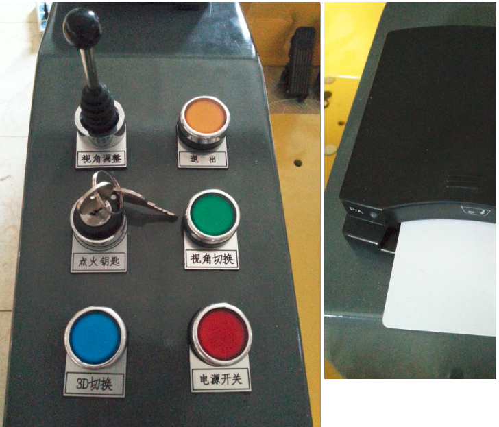 转向控制器 档位控制杆 转向控制器:其功能是当推土机拉动转向操作杆后,推土机实现改变行驶方向。 功能控制按钮:该组合控制按钮包括:反3D切换按钮、驾驶室视角及外部视角切换按钮、点火开关、一键开关机功能、退出控制按钮等,配合软件设计以此实现各种强大的操作功能。 身份信息读卡器:读取学员身份信息进入软件,并配合教师端管理系统将学员身份信息、操作信息、考核成绩等数据存储到服务器,打印机进行成绩汇总打印。 视角调整摇杆:可实现270度视角查看,真实再现工地视景,方便学员进行操作训练。