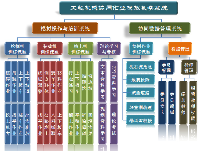 1、 训练课题按照三个模式分别进行操作训练:基础训练,考核操作和理论学习。 a)基础训练课题包括:1、行走练习2、推砖块3、推土作业4、回填沟渠5、翻土作业6、平整场地7、铲除障碍8、修边坡9、空动作10、自由作业操作等功能模块。 b)协同作业模式:1、山体滑坡(道路清障)2、地震抢修3、堰塞湖疏通4、泥石流清淤5、雪灾抢险 c)理论学习包括: 1)、理论文档:包含推土机安全、操作、保养等方面的理论文档资料,丰富详尽的图片及文字说明彻底解决了培训学校在教学中的理论知识缺乏等缺陷! 2)、教学录像:利用该功能,可以播放60盘工程机械操作的各种安全、保养、操作知识等教学录像,为学员提供实用、规范的实际真机操作演练! 3)、理论考核:依据安全教育和培训教学大纲、教材编写了标准化试题,可自主添加考题。