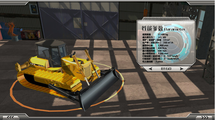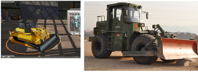 基础训练 考核训练 2、该推土机模拟软件提供二种3D不同类型(履带式、轮胎式)的推土机模型供学员选择练习。 实现一台模拟器就可以让学员练习到不同类型的推土机操作方法,提供全方位的训练内容,为以后的毕业实习打下坚实的操作基础。