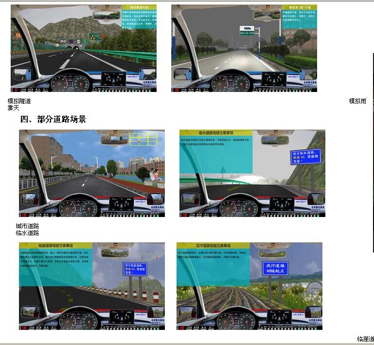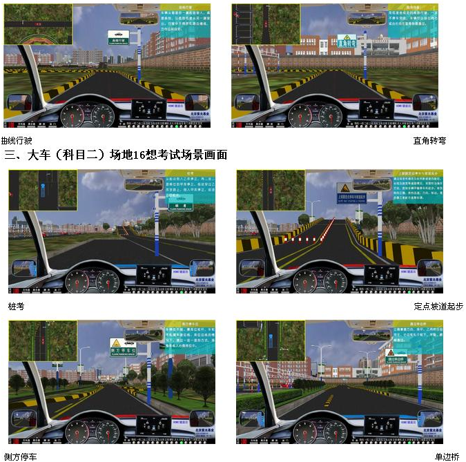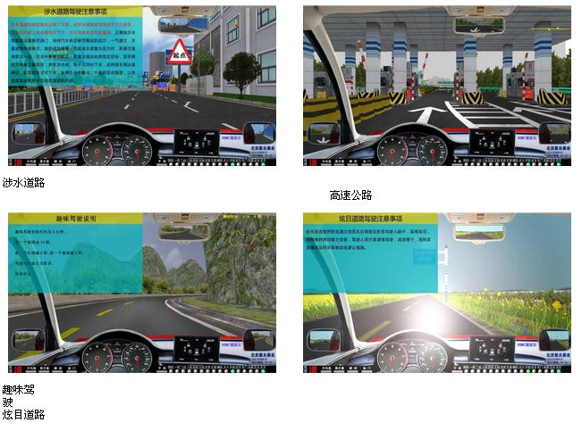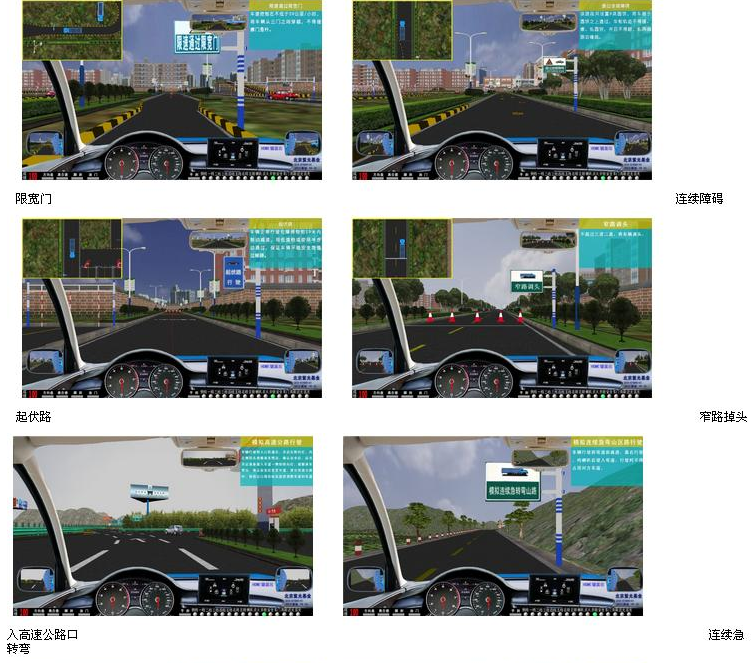 模拟训练项目:泥泞道路、危险场景、石子路面、涉水道路、山区到路、乡村道路、城市道路、高速公路、桩考、坡道定点停车和起步、侧方停车、通过单边桥、曲线行驶、直角转弯、通过限宽门、通过连续障碍、起伏路行驶、窄路掉头、模拟高速公路、连续急弯山区路、隧道、雨(雾)天、湿滑路、紧急情况处置。道路驾驶技能考试内容包括:上车准备(系安全带)、起步、直线行驶、加减挡位操作、变更车道、靠边停车、直行通过路口、路口左转弯、路口右转弯、通过人行道、通过学校区域、通过公共汽车站、会车、超车、掉头、夜间行驶等训练考试项目.