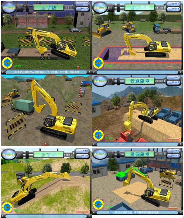 软件科目 1、录像与理论文档:施工方法基础、禁止作业内容、安全事故分析、安全知识、操作知识、保养知识、甩方作业、装车作业、找平作业、挖沟作业、上下坡、上下板、首届全国挖机大赛上、首届全国挖机大赛下。 2、入门学习训练科目:空动作、范例装车、90度挖土甩方、行走课题、剖面找平。 3、实践训练科目:挖日字型沟槽、行走装车、上下坡、挖沟刷坡、平面找平、上下板。 4、考核模式综合训练。 5、娱乐模式训练科目:狙击炮火、雷霆探险、行走独木桥、打地鼠。 6、可选择机器品牌:住友、柳工、卡特、日立、小松、泰山嘉和、大宇、山重、SHINING。