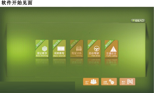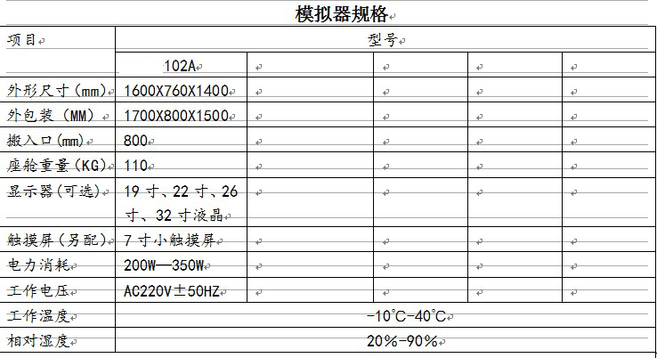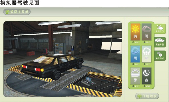 五、座舱说明: 座舱由驾驶舱座,视景计算机,视屏(22寸显示器,《显示器大小可以根据客户需求定做》),操作传感器,数据采集卡,耳机和话筒等组成。 座舱包含了,“五大”操纵机构:方向盘、离合器,脚刹,油门和手刹。倒档、一档、二档、三档、四档、五档和空挡(自动档只含前进档、倒车档和驻车档)操作开关:左转向灯、右转向灯、喇叭、点火开关、总电开关、安全带、雨刷、远光灯、近光灯。 座舱既可以进行联网训练,也可以进行单机训练。利用主控台计算机,最多可以将30台座舱连接到一个训练场景进行训练。 学员通过操作不同的操作部件,经过各自的传感器产生不同的操作信号,这些操作信号通过数据采集卡传送给计算机,经过各种训练模型的逼真运算,最后在视屏上输出与操作相对应的三维场景与各种声音。
