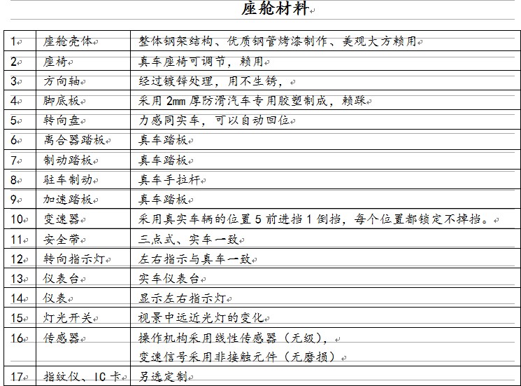 1.远近光及转向开关 2.驾驶模拟器机壳 3.桑塔纳2000方向盘 4.系统显示屏 5.功能选择鼠标 6.汽车雨刮器 7.启动点火钥匙 8.离合器 9.脚制动 10.油门 11.系统启动电源 12.变速器(6挡) 13.中央通道 14.手制动 15.三点式安全带 16.调节汽车座椅 17、7寸触摸屏