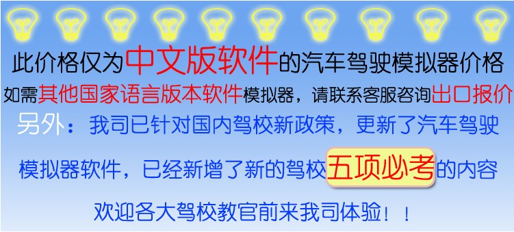 电脑汽车驾驶模拟器 电脑汽车驾驶模拟器针对驾校来说,节省成本: 新版汽车驾驶培训模拟器,完全符合国家交通部颁发的最新标准JT/T 378-2005.软件项目齐全,9选6考试课程完备,各类型路况驾驶完备,场地驾驶包括 1、倒车入库; 完全满足学车者的要求。道路的模拟部分和标志标线全部按照国家交通法规设计、道路全部为国内道路,各操作方法与真车无异,视觉效果采用计算机实时成像、流动的白云,来往的各种车辆,立体的山脉,栩栩如生的树木,逼真度高,能实时模拟汽车驾驶的运行环境和操作效果。是驾校节约成本的首选。 三屏汽车驾驶模拟器 3D汽车模拟训练机 安全注意事项: 不正确的使用会导致触电或火灾事故。为防止发生危险情况,请在安装使用及清洁本产品前仔细阅读下述安全注意事项,并遵照执行,以确保您安全及延长本产品的使用寿命。