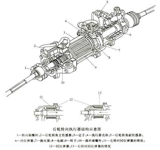 四轮转向系统原理: 四轮转向系统中的后轮也可以转向; 后轮转向根据车辆速度(或者转向盘的转角)来控制。 在车速较低(或转向盘转角很大)时,后轮的转向与前轮相反。 当车辆行驶速度较高(或转向盘转角较小)时,后轮的转向与前轮相同。 21.4.1电控四轮转向 在电子控制的四轮转向系统中,前轮转向器和后轮转向执行器之间没有任何机械连接装置,后轮转向执行器由转向电子控制模块来控制。 电子控制系统中的四轮转向系统利用转向盘转动速度、车辆行驶速度和前轮转角的信息来计算并控制后轮转角。 1.后轮转向执行器  包含一个通过循环球螺杆机构驱动转向齿条的电动机。 嘉育汽车教学模型厂 021-62177999 鲍经理 上海北京西路605弄57号