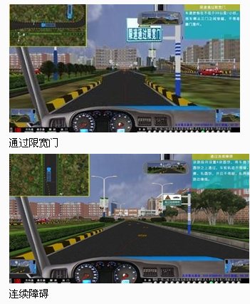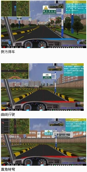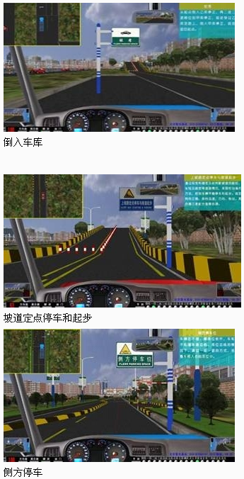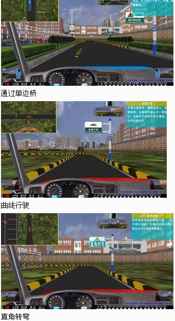 中央监控台由P4计算机、19″显示器、打印机、 100M 网络交换机等组成。监控计算机可以监控任意一台模拟器,监视窗口将显示与被监视模拟器完全一样的画面,并实时图形显示其“五大”操作件——方向盘、离合器、脚制动、油门及手制动当前的状态;另外档位、喇叭、转向灯、点火开关等的状态也通过图示表示出来。监控计算机可以查看联网的每一台模拟器当前错误操作的明细情况,并将训练成绩进行打印。 一、小车(科目二)场地5项考试场景画面: