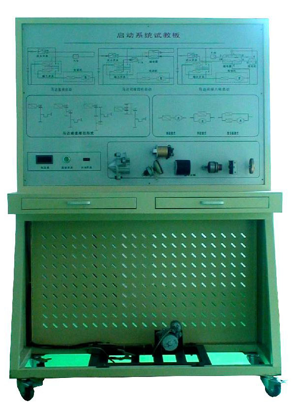 二、汽车电器设备线路故障实训台 起动系统连线实验台: 1、配置原厂全新的桑塔纳3000起动系统部件,包括原车起动机、蓄电池或29A以上电源模块、起动继电器、点火开关、自动变速器档位开关、保险丝与插座及原厂插接件等相关所有部件。 2、实训台配元器件固定面板,面板上整齐地布置起动系相关部件,相应位置有部件中英文标识及部件内部结构电路原理图,2mm数控雕刻的铝合金面板,根据原车线路图颜色进行着色,保证整个设备的面板图的立体感.电路图的每个执行器的线脚设有4mm检测端子.与之配套的连接端子线可以保证多次拔插而不损坏.实训台配元器件固定面板,并在面板上为各部件的线路插头布置连接孔(标注相应原厂插头针脚标号)。采用原车启动系统,保持原车布局,各系统工作正常。起动机分解部件与实际可运行充电系统两者相结合。面板上面镶有分解部件。面板下部采用原车布局的桑塔纳启动系统。 3、数量保证配二套连接电线,电线应符合电气(电流)标准安装要求。 4、实训台配安全保险装置(具有自恢复功能,且保证连线错误时,能自动保护线路)、电源负极安装总闸刀及电源工作指示灯。主要线路也设有LED指示灯,如果连线正确指示灯亮,如果连线错误指示灯处于熄灭状态,学生从而需要重新查找线路,以至于完成正确的路径. 5、实训台(长X宽X高:1mX0.5mX1.7m),留有25CM以上宽度的水平桌面,便于放置万用表、连接用电线以及实验报告书等;实训台配抽屉(长X宽X高:0.5mX0.4mX0.25m),用于存放连接用电线;能够轻松移动,配置带制动功能的万向脚轮(尼龙轮),台架采用高温喷塑(米黄色),保证足够的强度。台架框架采用40x40X1.5mm的方管.金属材料不小于1.5毫米,塑料材质不小于2.5毫米。 6、配套详细完善的使用说明书。