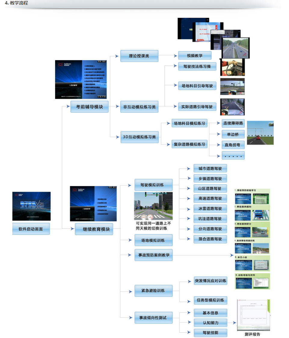 1.系统构成 电子教练机主要由互动型视景系统、模拟教学专用软件、电控系统、模拟座舱、附属设备和外饰件等六部分组成,主观视角可达到120︒。分为3A1大车型和3A1小车型两款产品。 2.适用范围 电子教练机可以弥补培训机构师资不足的缺陷,而且还可以减少教学人员的劳动强度,通过“理论、模拟加实车”的培训模式,可以大幅度提高实车训练效率。电子教练机适用于初学驾驶人单人上小课或自主学习驾驶技能的需要。 3. 教学功能设计 电子教练机采取以学员为中心的教学结构设计,学习者可以自主完成驾驶技能的理论学习、道路模拟驾驶练习、事故案例体验、紧急避险模拟训练。 教学内容由考前辅导和继续教育两大模块组成。其中考前辅导模块由模块化学习、推荐学习、数据库学习、事故倾向性测评、驾驶模拟练习等五部分构成,继续教育模块由驾驶模拟训练、紧急避险训练、事故预防案例教学等三部分构成。 电子教练机可代替教员完成科目一、科目二、科目三的全部理论授课,以及模拟练习的导教工作;可满足单人上小课的需要,既统一规范驾驶动作,又可保证教学质量。 据交通管理部门披露,造成道路交通事故的原因很复杂,涉及人、车、路、环境和管理等诸多因素,其中,驾驶者是引发道路交通事故的主要原因,驾驶员自身的事故倾向性已经越来越为人们所重视。 电子教练机可以进行汽车驾驶人事故倾向性的测评。驾驶事故倾向性测评系统是利用心理学的方法在模拟环境中测量驾驶员的事故倾向性,并针对个人薄弱环节提出具有针对性的建议,以期提高驾驶员在真实环境中的行车安全,减少交通事故的发生。 4. 教学流程