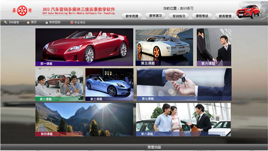 2016汽车营销多媒体三维实景教学软件 考试模块:实景仿真报告、实景演讲练习、实训考试练习。 软件特点一:按照比例建立用三维技术建立的4S店,使用者可360°任意旋转,并展开情景教学。 软件特点二:使用者可选择不同的职业类型进行学习,真实体验并领悟实际工作中应掌握的技能。 软件特点三:软件设置考试模块,并支持作业布置与交付,真正实现实训+考核一体化教学。