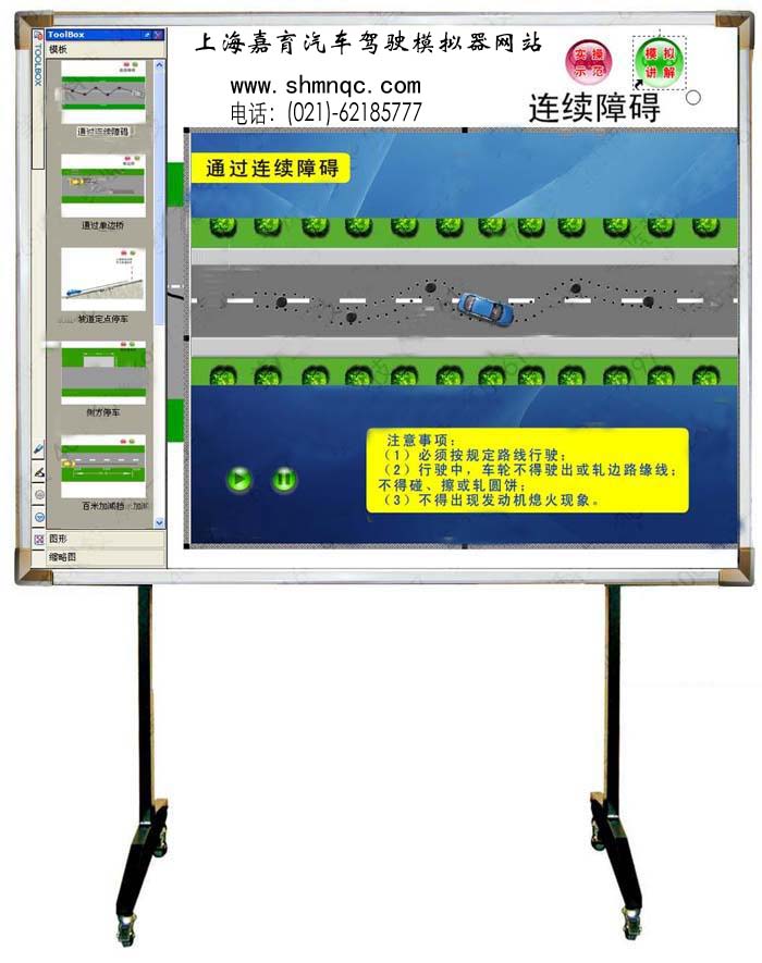 教学磁板及驾驶员培训专用互动软件将教学大纲四个阶段的内容与考试大纲科目一、科目二、科目三的内容融会贯通,通过对“驾培专用教学磁板”软硬件的结合使用,可以任意组合各种交通场景进行讲解,模仿真实路况;任意调用场内道路驾驶场景,并对车辆进行模拟操作;可以直接控制汽车行驶、记录车辆行驶轨迹、讲解行驶过程、模拟各种道路交通环境、模拟事故案例等;可在教学磁板上用电子笔直接书写、擦除、标画讲解对象,电子笔可以代替鼠标操作电脑;可用教学磁板控制多媒体动画、视频、声音等教学课件。“驾培专用教学磁板”为驾校提供了先进的教学手段,填补了其他教学设备的功能空白。