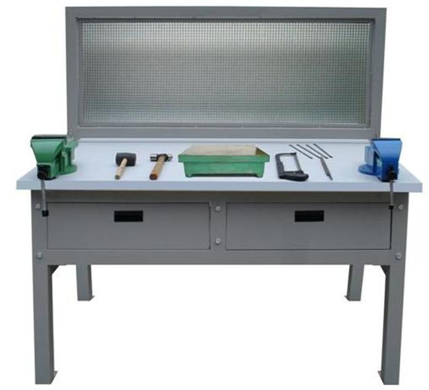实训台为铁质材料,桌面为木质材料,且有橡胶垫一块附于桌面上,保护操作台面。整体结构坚固,造型美观大方。实训台设有两个抽屉(带锁)分别用于放置工具及资料等。