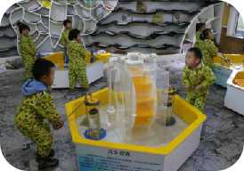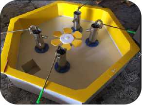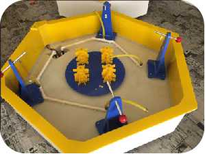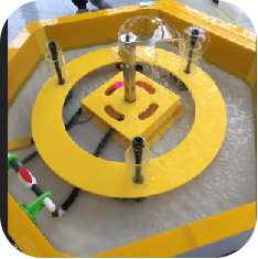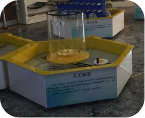 通过摇把,搅动容器里的水,形成一个漩涡,观察漩涡里面的小球有什么变化? | 8个模块,每个模块规格尺寸0.8米的六边型蜂巢组合。 | 玻璃钢水池,适合室内外安装。 |