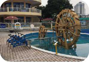 四个骑行位置,链条加减速机传动,属大型景观水利机械,是动能与势能的转化演示。具有安全、美观、互动 | 水车直径2.5米,防腐木材质 | 不含水池 |