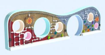 通过阀门控制水泡的大小,水泡中有烟雾效果,探索和观察水的张力特点。 | 每个模块规格尺寸0.8米的六边型蜂巢组合。 | 玻璃钢水池,适合室内外安装。 |