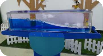 两个小朋友通过摆动透明密闭容器内海水,摇动装置,容器内的液体会呈现浪花,摇动的幅度不同,浪花的大小也不一样,同时会涌现出海浪的效果和声音。 | 长120cm,宽30cm,高100cm | |