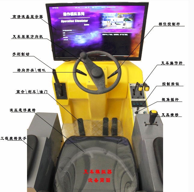 该设备硬件由驾驶座椅、驾驶座舱、底座平台、PC系统,视景显示器,方向机,档位杆,操作杆, 360视角调整摇杆、油门制动离合踏板,手刹制动杆,数据采集卡、中枢控制台及各种功能控制按钮组件等组成。设备采用与真机相同的操作部件,逼真的操作手感,使得其操作功能、操作感觉与真机完全吻合;