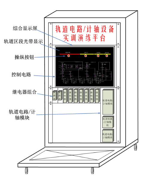 轨道电路或计轴设备实训演练平台由信号组合柜、继电器、轨道电路发送盒、接收盒、衰耗盒、电缆模拟网络盘、计轴主机、磁头、轨道及控制电路状态显示计算机、显示屏、多路数字量驱动采集模块、电源模块、断路器、组合板、练功平台车等设备组成。设备外观结构如下图所示。