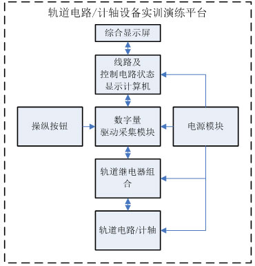轨道电路/计轴设备实训演练平台通过轨道区段占用/出清模拟,采用真实轨道电路发送、接收、衰耗模块设备或计轴主机和磁头,在综合显示屏上显示轨道相关状态,在轨道状态发生变化时并勾通相应的表示电路,点亮对应的表示灯。此练功平台能使学员在较小的室内空间内达到身临其境的感觉。同时通过轨道电路/计轴的实时显示,直观的反映电路的动作情况,从而达到常规现场教学无法达到的效果。平台各部件间接口如下图所示: