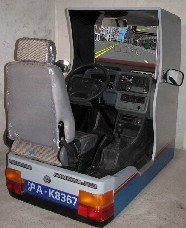 {一}座舱结构,驾驶操纵由“五大”真车部件: ①转向总成系列使用灵活,坚固稳定,拟底盘加重感受。 ②真车工作台及仪表中里程、水温、油量、转向、供电、点火等等。 ③(四大)制动操作经过传感器灵敏驱动。 ④变速换挡,微拨紧锁、层次分明。 ⑤移动座椅、三视镜、车门、安全带等等 特长:大型模具注出ABS立体框,模拟的两端具有刹车尾灯,转向灯显示。 {二}图象: ①视景由计算机顺行三维图象,三维图明显提示进行。 {三}计算机: 计算机配置:CPU:celeron2.4 显卡 64M内存 256硬盘 40G视景计算机,视屏(29寸彩电/19显示器)数据传感板,数据采集卡等组成。
