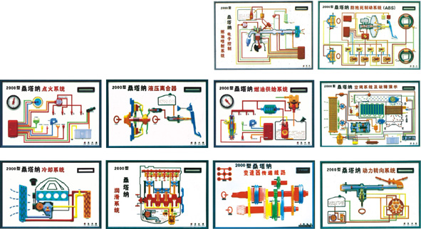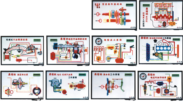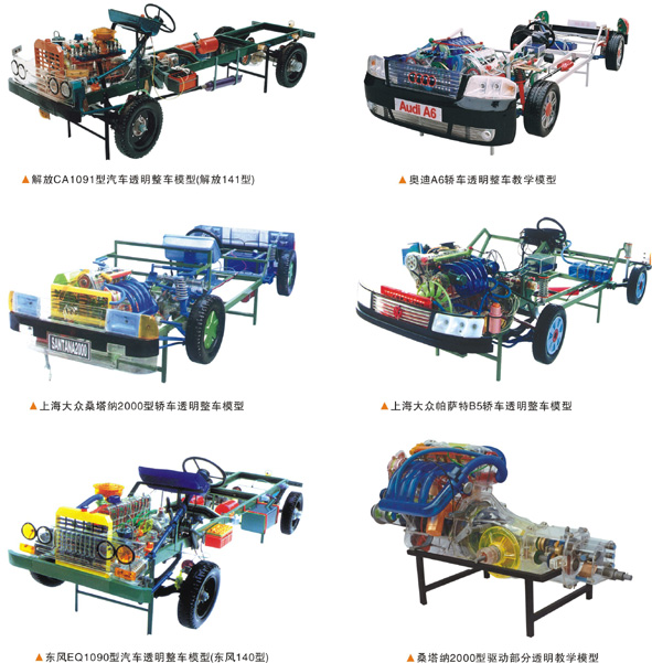 产品特点 本公司生产的汽车教学模型、示教板、演示台等产品,外壳采用进口透明有机玻璃一次压铸成型,演示部分采用光电组合,主要部位用金属材料加固,透明直视,运转自如,使教学达到事半功倍的效果。 1、CA10B、EQ140、CA141等车型按实物比例0.6制造。桑塔纳、帕萨特轿车按实物比例0.8制造。 2、以上几种汽车模型均用有机玻璃制造,具有运转灵活、明显直观、重量轻、彩色工艺先进、运输拆装方便之特点。 3、演示时插上220V电源,将起动开关打开,使发动机启动,经离合器、变速箱、手刹、传动轴至后桥、驱动后轮、使学员更清楚了解汽车的各部位动作,以达到教学之目的。 桑塔纳2000型电动程控电教板 全套共10件 产品简介 本品采用铝合金框架,表面采用彩色有机玻璃压模成型,线路流程方向灯光演示,程控教鞭控制,转动式字幕显示。 规格:1200x800x200mm;电源:12V直流电源。