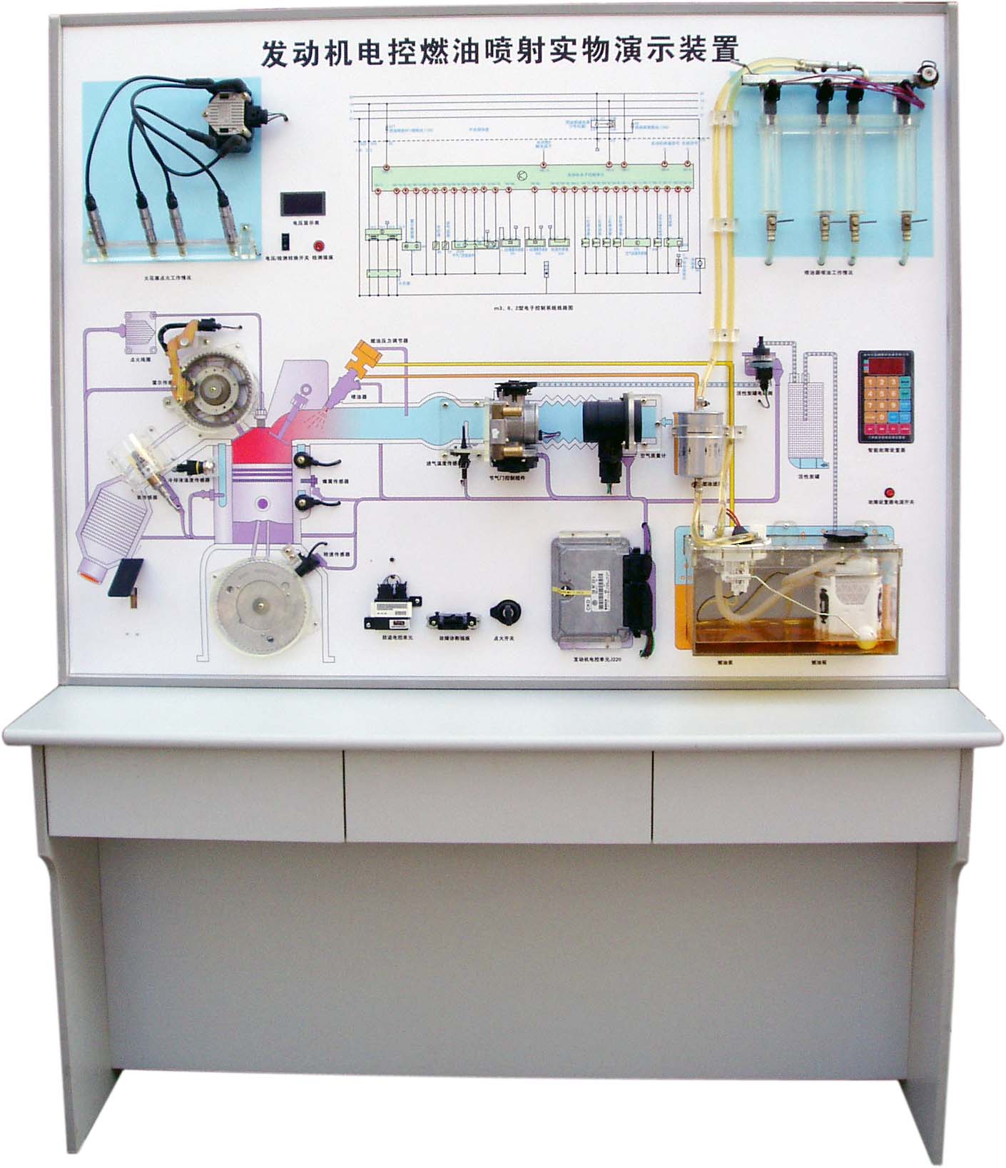汽车实物教学示教板 本启动系统示教板是本公司采用现有的本田车系统为适应汽车教学需求而研制的,该示教板由启动机总成、拆件、结构为一体、操作显示面板电气原理及电控柜、可移动支架等组成、具有结构紧凑、操作方便、安全可靠、教学直观,具有启动系统运转及显示功能。是汽车实物教学不可缺少的实验室设备之一。 二、技术性能 1、主要参数值: ●启动系统工作电压 12v 500W ●最大电流 100A ●主电源 交流220v、50Hz ●设备重量 50Kg ●外形尺寸 1000×500×1500mm 汽车实物教学示教板 把发动机电控系统单独取出,安装在实验台上,模拟发动机工作时电控系统的工作情况以及工作原理。可演示喷油,点火,节气门,空气流量计,防盗电脑以及各传感器的工作情况。喷油量,点火频率可根据转速的不同而变化。(喷油所用的液体为特殊液体,不易燃,不易挥发)各主要传感器均配有电压表可实时显示其工作时的电压变化。OBD-Ⅱ诊断接口便于用解码器读取故障码,清除故障码,读取动态数据流以及配钥匙。 规格:1400×600×1800mm