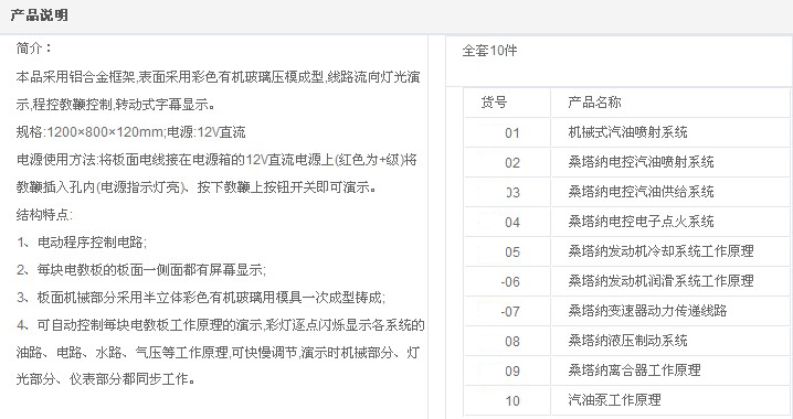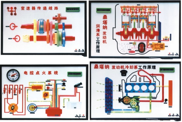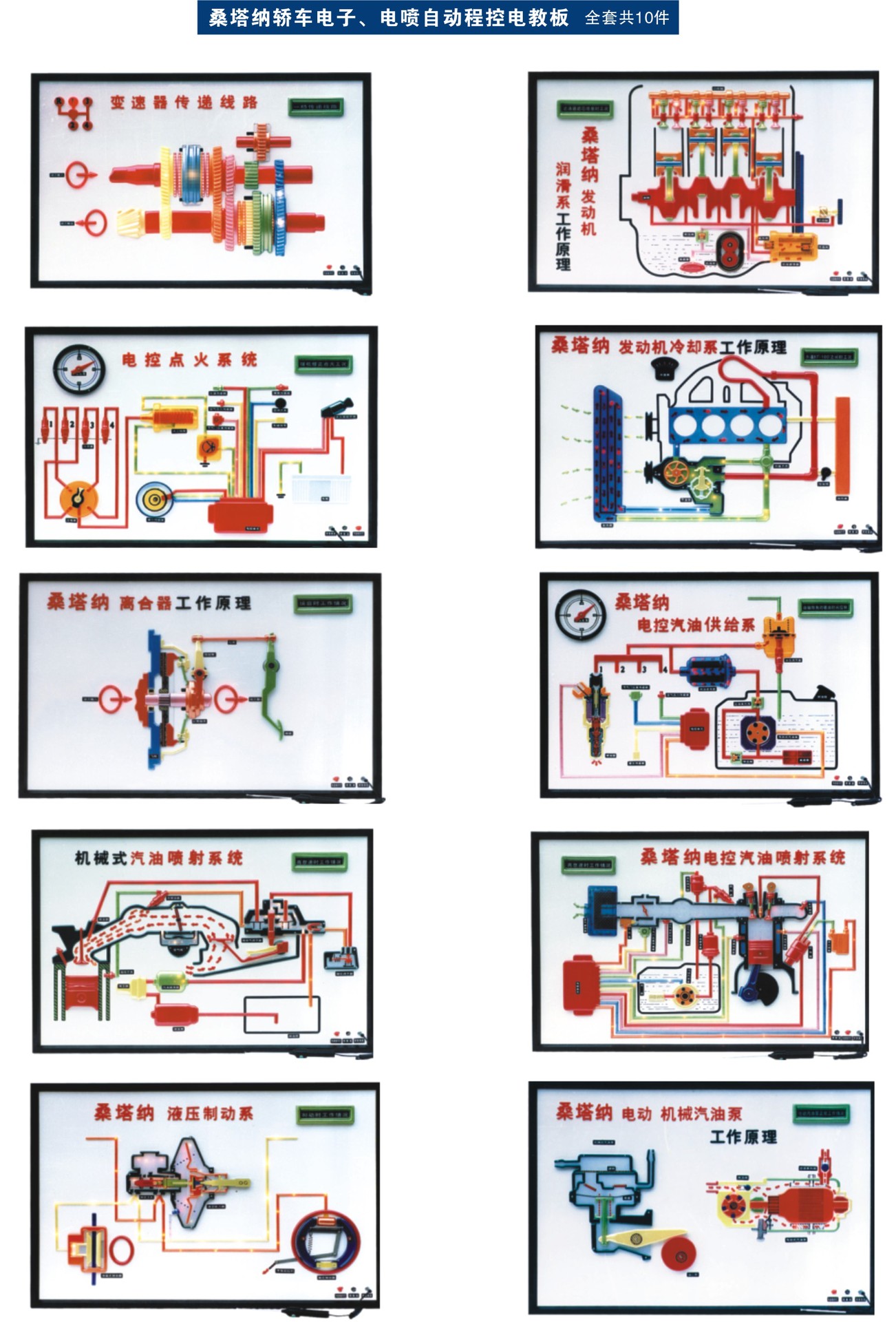 结构特点: 1、电动程序控制电路; 2、每块电教板的板面一侧都有屏幕显示; 3、板面机械部分采用半立体彩色有机玻璃用模具一次成型铸成; 4、可自动控制每块电教板工作原理的演示,彩灯逐点闪烁显示各系统的油路、电路、水路、气压等工作原理,可快慢调节,演示时机械部分、灯光部分、仪表部分都同步工作。 上海大众帕萨特B5轿车电动程控电教板(全套10件)