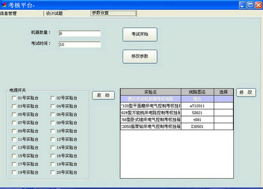 在一个实验室里可以分不同的考核内容防止学生之间抄习,教师在给学生出试题时有四四张试卷供老师选择和随机选择,被选中的学生显示“红色”,已设置好的学生根据不同的试卷显示不同的颜色并在姓名旁边在上卷名(A卷),设置好的试题都保存在服务器上,再次设置时能显示以前设置好的信息。 八、基本信息查询及修改