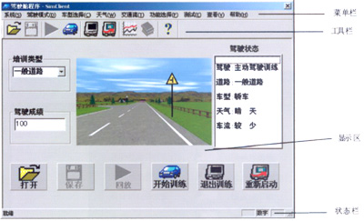 主操纵界面可分为菜单栏、工具栏和显示区等3个区域。其中菜单在为模拟器的使用提供了各种选项;工具栏提供各种操作命令;显示区用于显示所选场景及驾驶状态。为了方便使用,将培训类型选项、开始训练、退出训练命令、及驾驶成绩显示等放入显示区内。
