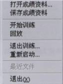 系统菜单作用和Microsoft Word中的文件菜单类似,如图所示,包括:成绩信息、保存、回放、开始训练、退出训练、重新开始、最近文件。其中: