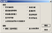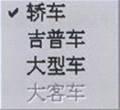车型选择菜单如图所示,该菜单项包括了3种车型:轿车(默认车型)、吉普车、大型车。“√”为选中状态。选中的车型会在驾驶状态信息框中提示。